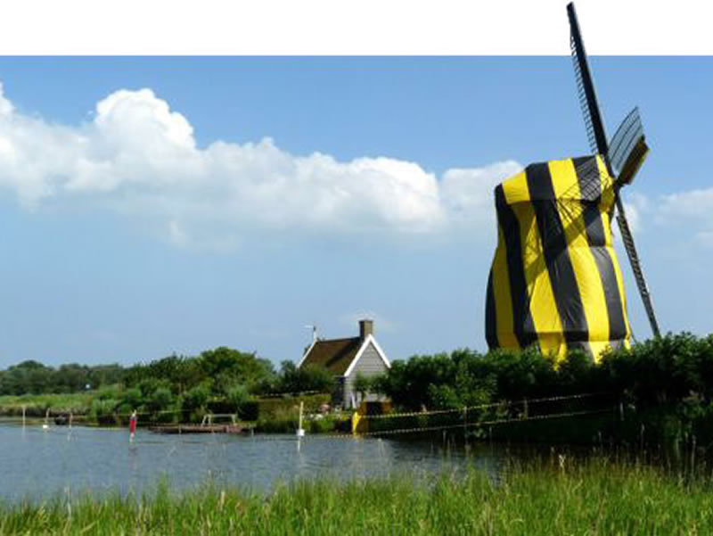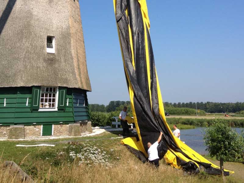 Nadat de grote lappen zeil met een kraan losjes over de molen waren gelegd, kon begonnen worden met het gasdicht maken van ‘het cadeau’. Modieus getailleerd miste de met zijn omgeving contrasterende cadeauverpakking eigenlijk alleen nog een grote strik…..