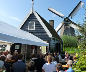 Tijdens een kort betoog zette Marcel het reilen en zeilen rondom de Twiskemolen uiteen. Een groepje geïnteresseerden werden aan het eind van de middag door hem rondgeleid in de molen.