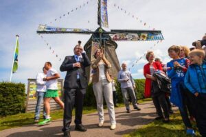 Toeterende burgemeesters zetten versierde Twiskemolen in werking